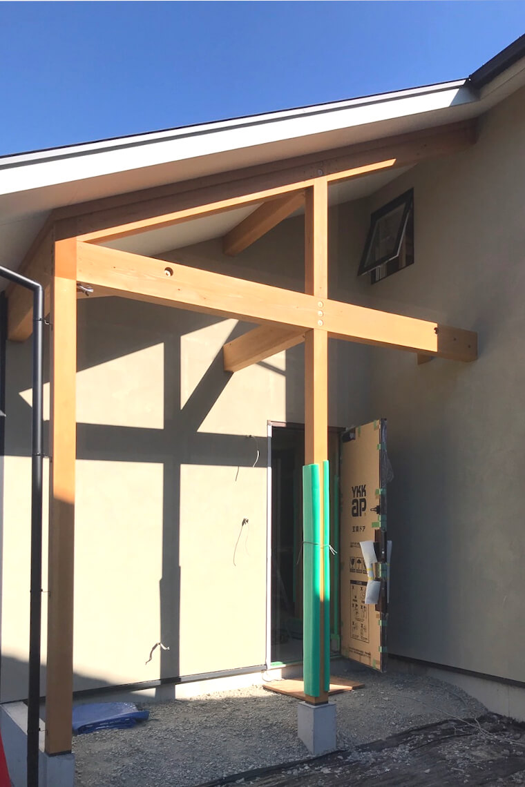 大屋根で玄関ポーチをかぶせ、外観は「和」を基調としたガルバと塗りの組み合せで落ち着きをもたせました。