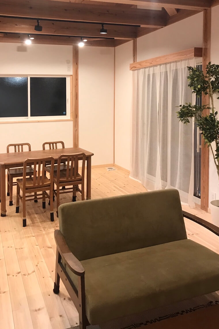 室内は柱が見える真壁造り。梁や火打ちも見え、仕上げは無垢材を使い、心地よい空間になります。