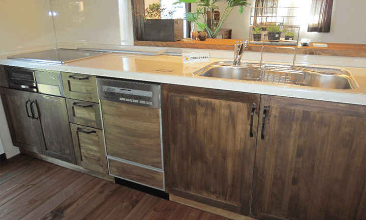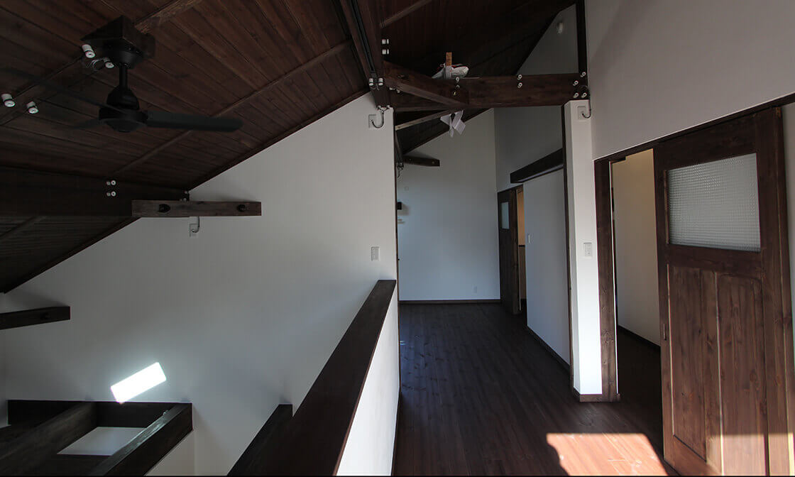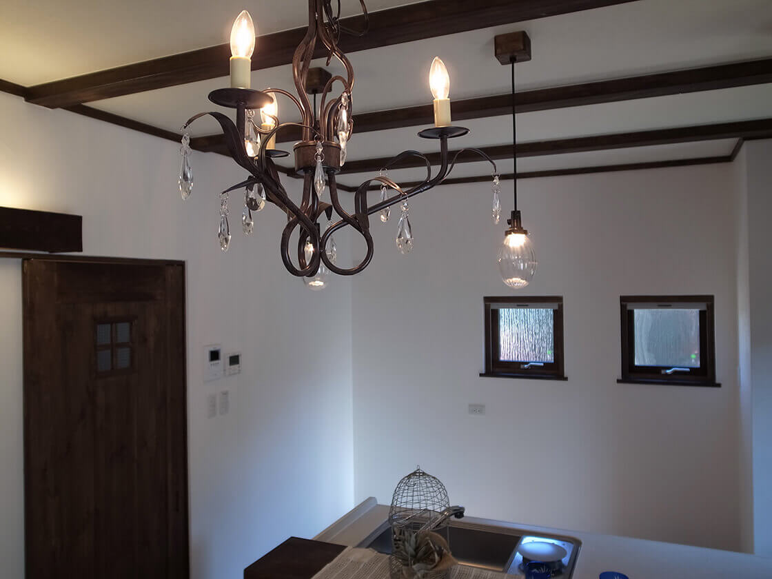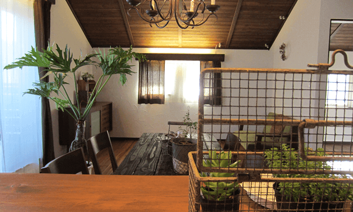 柱だけでなく、天井の板、収納家具を古木調のパイン無垢板で。アイアンを使ったオリジナルのダイニングテーブルや収納家具をチョイスすれば、こだわりのアンティークテイストが実現します。