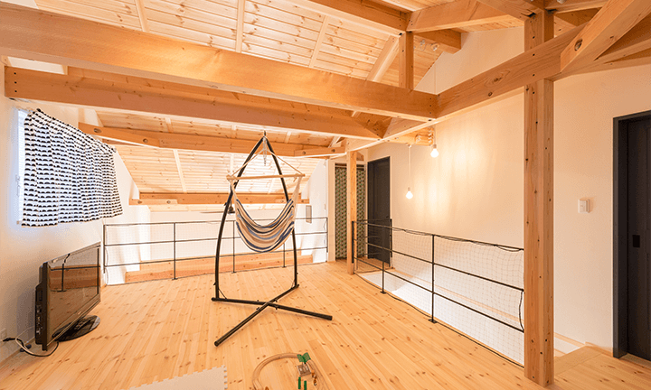 吹き抜けの空間を活かして大きな布を飾る、ハンモックやブランコを取り付ける、お気に入りの絵を飾る、サーフボードや自転車もインテリアに!