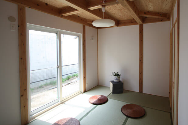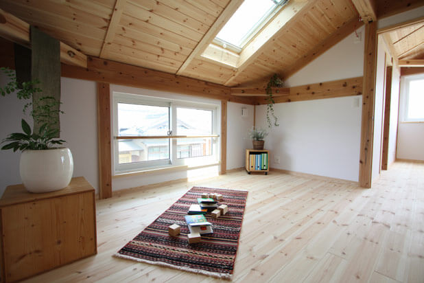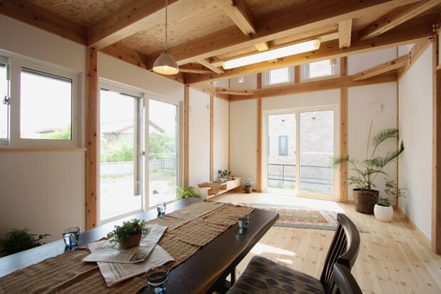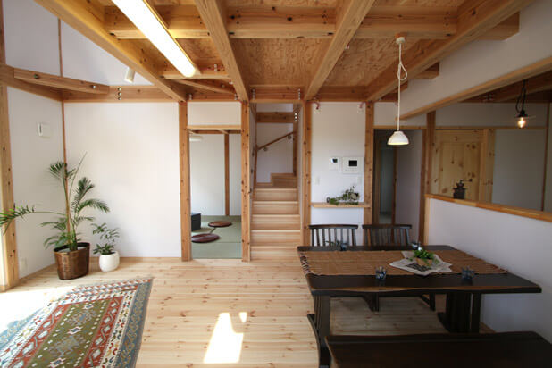 伊知多の家 木浴 室内に一歩足を踏み入れると、どこか懐かしい雰囲気が漂う空間が広がります。左右対象のきれいなシルエットが印象的な外観。 床面積:112.63㎡(34.0坪) /柱・梁4寸、ペアガラス樹脂サッシ 施工事例一覧