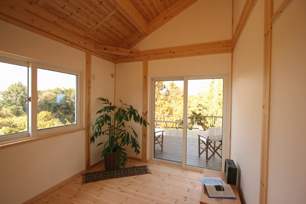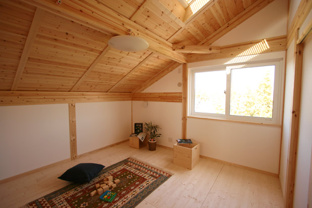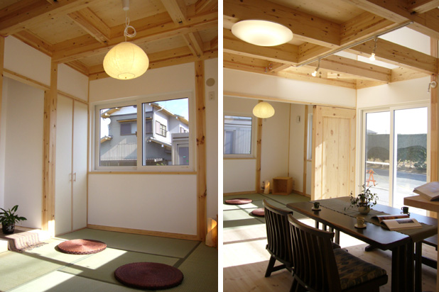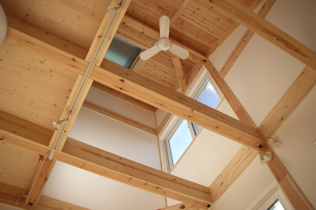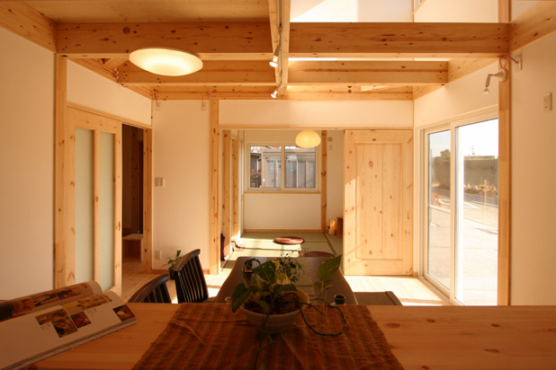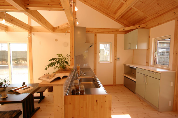 大屋根の家Ⅱ 木浴 ダイナミックな勾配天井が広がる大屋根の家。建物の裏側に広がる景色をとりこむことで広がりと四季の移り変わりを楽しめる。 床面積:106.0㎡(32.0坪) /柱・梁4寸、ペアガラス樹脂サッシ 施工事例一覧
